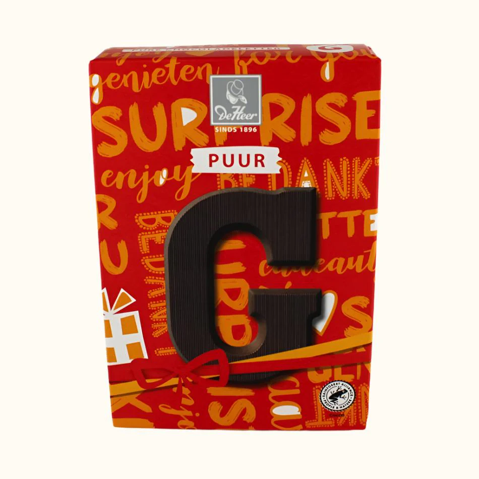 De Heer chocolate letters are made from 100% fair UTZ-certified chocolate and come in milk, dark, and white chocolate varieties. Each letter weighs 65 grams. Almost the entire alphabet, from A to Z, is available in milk chocolate. In dark and white chocolate, all letters are available except for Q, U, X, Y, and Z. A delicious and responsible treat for the holiday season!